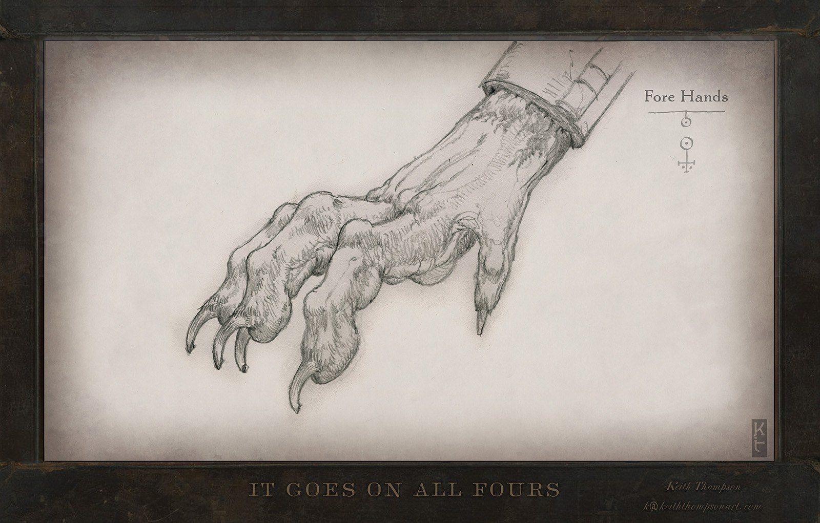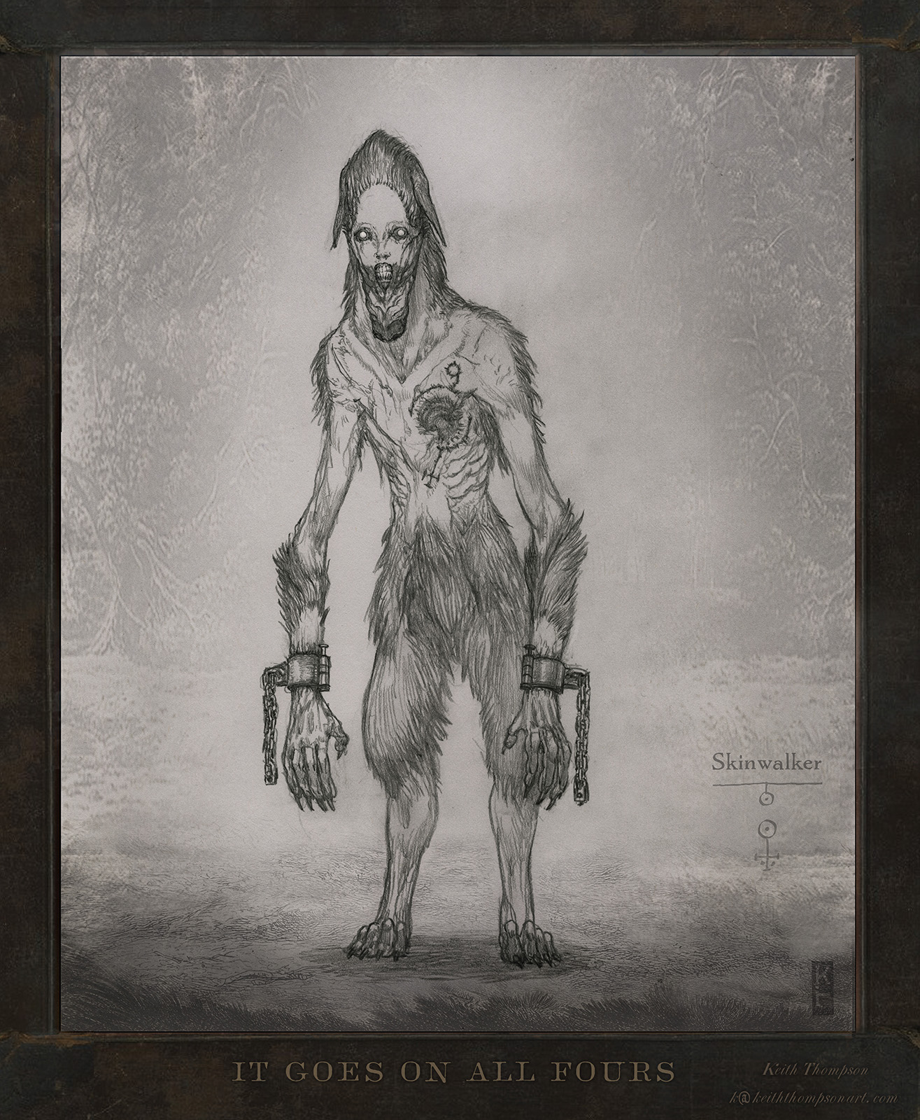 Designed by renowned creature designer Keith Thompson, It Goes on All Fours features a “yee naaldlooshii” – a skinwalker, which has many specific design features to tell its story visually. Shackles leave marks on its wrists and ankles, pointing to the enslaved nature of the beast. It leaves frost where it steps, as its blood runs frozen from its torn-out heart of ice.